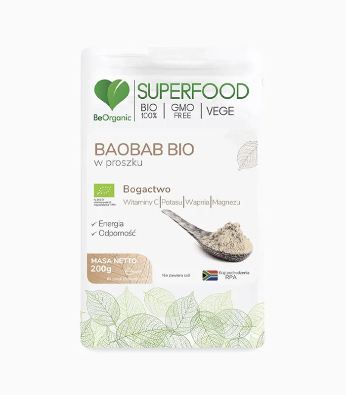 Organiczny proszek Baobab BIO, 200g od BeOrganic to doskonały wybór dla tych, którzy dbają o zdrowie i jakość spożywanych produktów. Ten produkt jest bogatym źródłem błonnika, który wspiera prawidłowe funkcjonowanie jelit (potwierdzone przez EFSA - błonnik). Dzięki wysokiej zawartości witaminy C, proszek pomaga zmniejszyć uczucie zmęczenia i znużenia (potwierdzone przez EFSA - witamina C). Naturalne pochodzenie oraz certyfikat BIO gwarantują najwyższą jakość, co czyni go idealnym dodatkiem do codziennej diety.