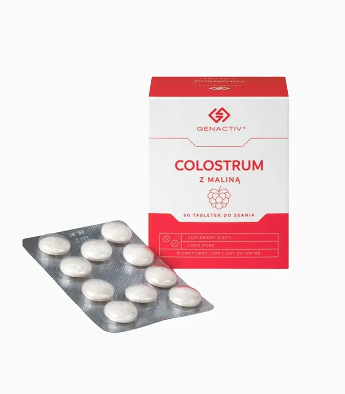 - Colostrum w tabletkach do ssania o smaku malinowym łączy przyjemny smak z praktycznym zastosowaniem.